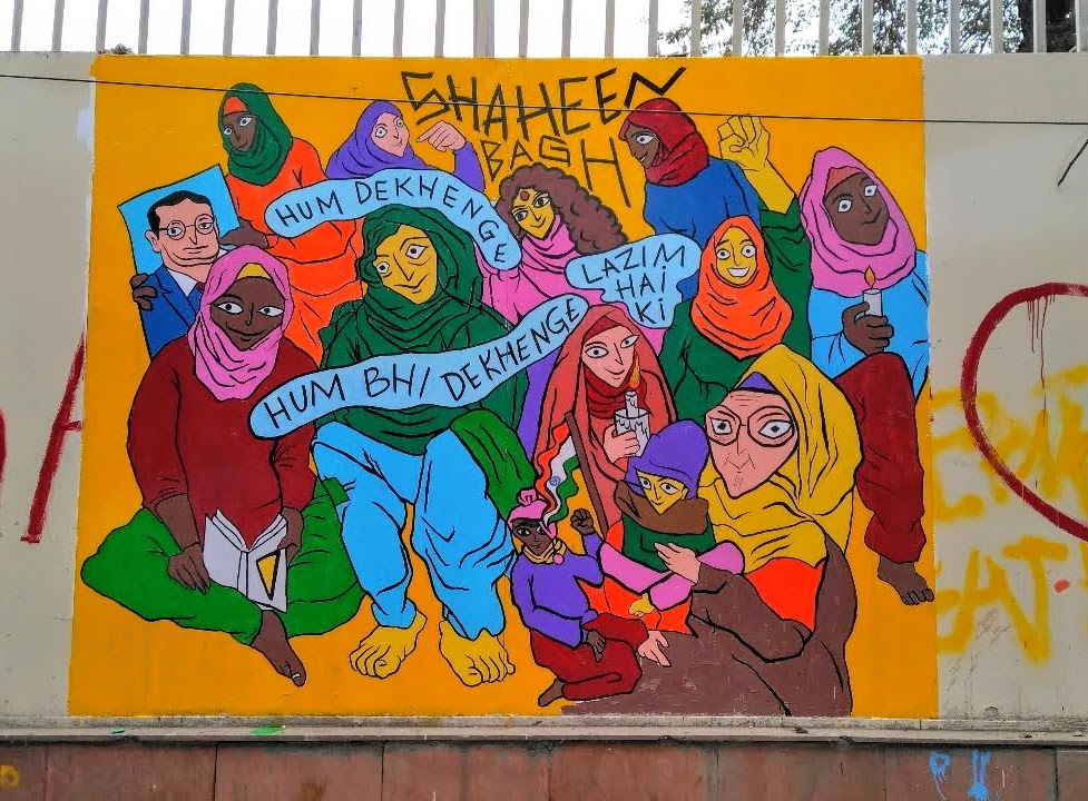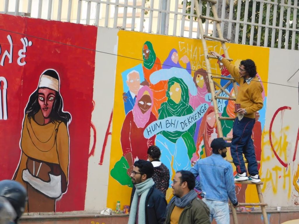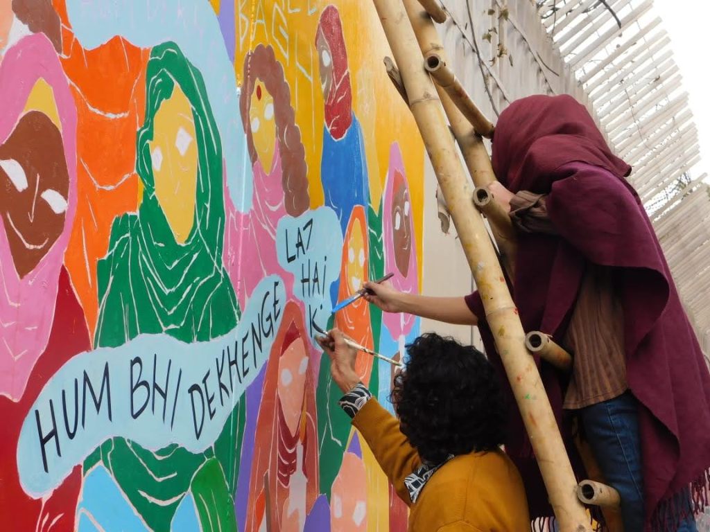 The mural was created in New Delhi in 2019 amidst the protests against the infamous discriminatory citizenship bill (CAA) in India, a law designed to strip millions of Muslims and other marginalized groups of their citizenship rights. Originating from my neighborhood, these protests quickly snowballed into a nationwide movement, sparked by the palpable sense of injustice within communities. Collaboratively designed with the protesters themselves, the mural served as a vibrant testament to this grassroots uprising. It celebrates the active participation and leadership of women of the neighborhood, who defied societal stereotypes to take charge within the movement. The mural also includes verses from Faiz Ahmad’s iconic poem “Hum Dekhenge” (We Shall See), a timeless anthem about standing up to oppression and persisting in the fight because we are certain that one day we shall see a world of justice.