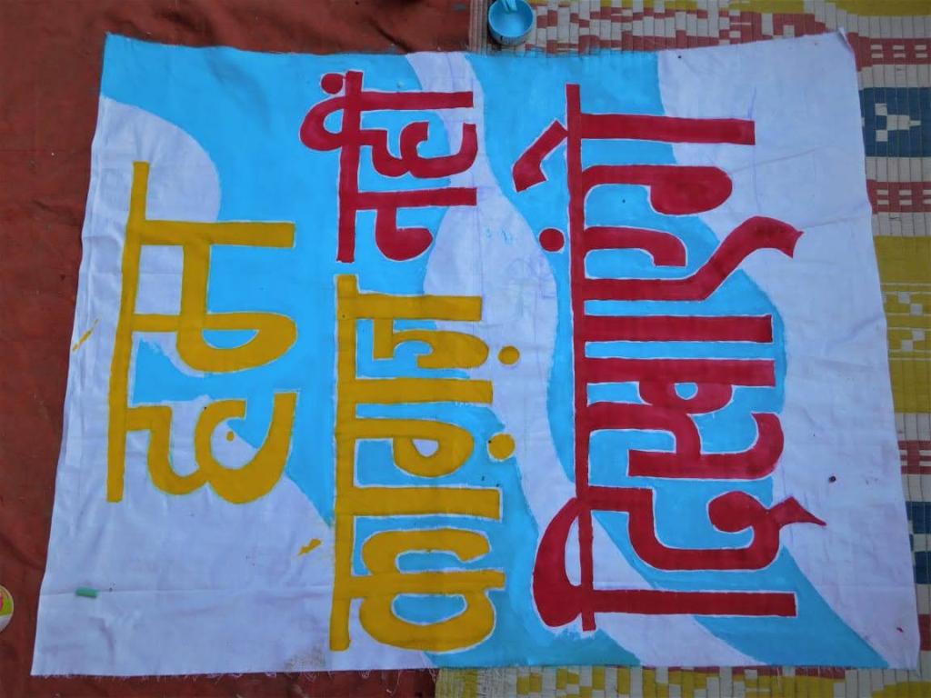 The hand painted banner was made collaboratively with the residents of Hauz Rani, a marginalized neighborhood in New Delhi India. In response to a discriminatory citizenship bill in India that aimed to deprive millions of Muslims and other marginalized communities of their citizenship rights, protests erupted in various neighborhoods, including Hauz Rani. The proposed legislation had the potential to impact the lives of long-standing Indian residents from marginalized communities, jeopardizing their citizenship rights. Amidst the movement, Varun Grover’s poem, titled ‘Hum Kagaz Nahi Dikhayenge’ (We will not show our papers), gained widespread popularity, advocating for collective resistance against the law through civil disobedience, urging everyone to refuse to comply with the document requirements imposed by the new citizenship legislation. The banner features a line from this poem. The community displayed a banner at the neighborhood entrance featuring a line from the poem to raise awareness and foster engagement in the protests.