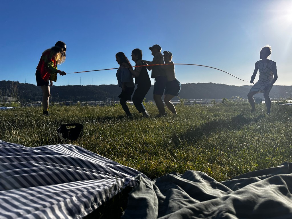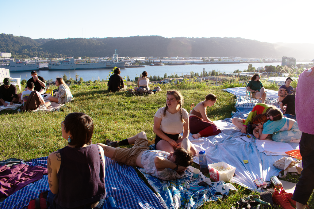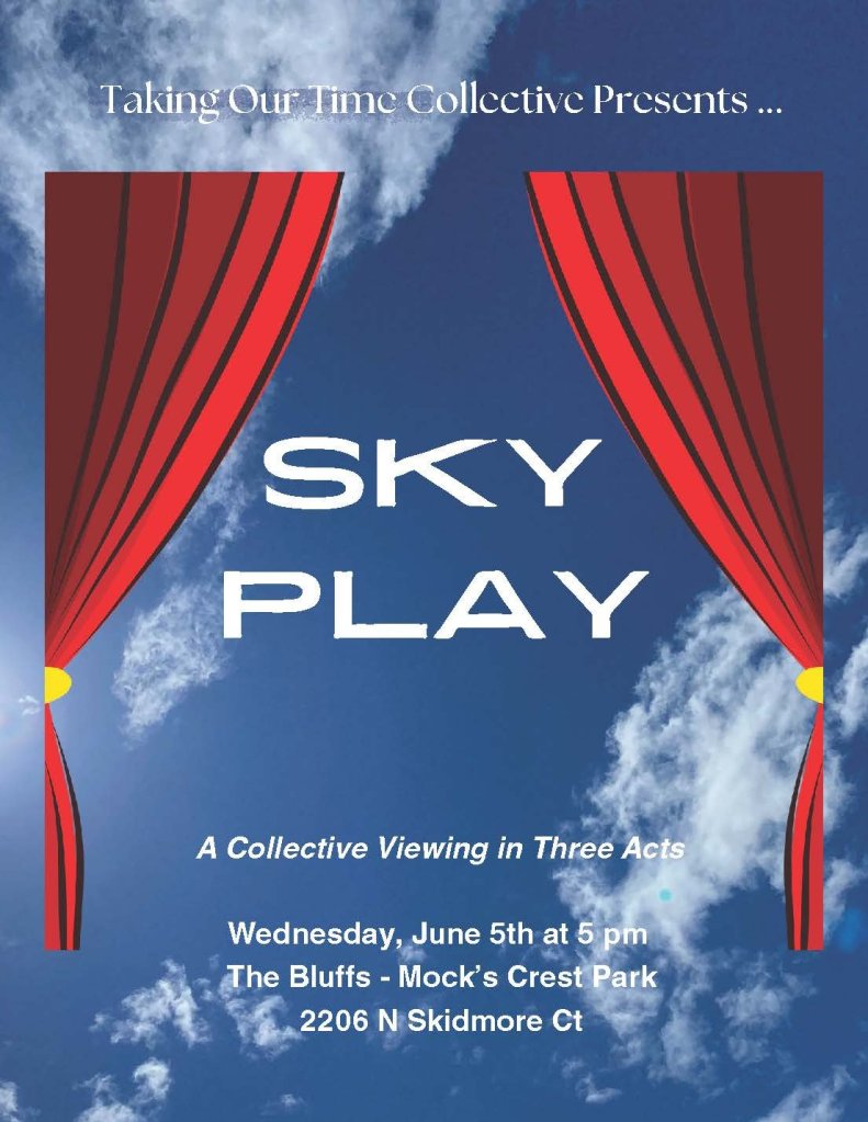 Sky Play was a public sky watching event Taking Our Time Collective hosted at Mock’s Crest Park in Portland, Oregon. This project consisted of tickets for the event with questions and musings, movie theater refreshments, and a lawn installation of lawn chairs and sky colored blankets the public was invited to lounge on while watching the day turn to night together one evening in May.